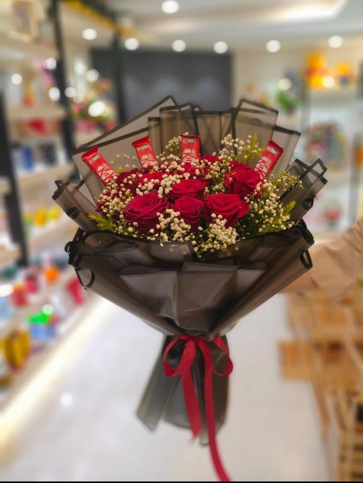 10 Red roses with gipso and kitkat