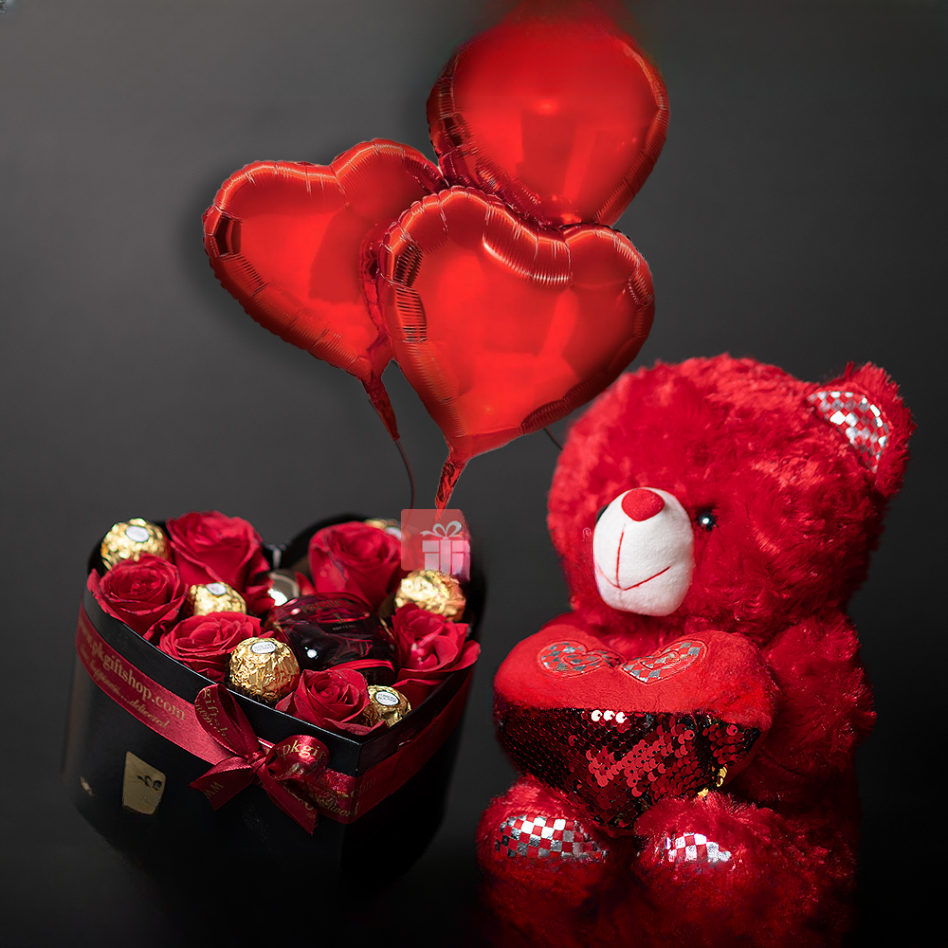 - Heart shaped box with 6 pcs Ferrero Rocher, 1 dozen red roses & J. Perfume