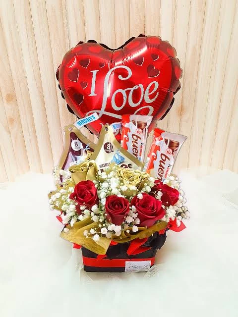2 Her shies Kisses Chocolate , 2 Chocolate Bars , Gipso With Red Roses And Love You Baloons Heart Shape In Box?