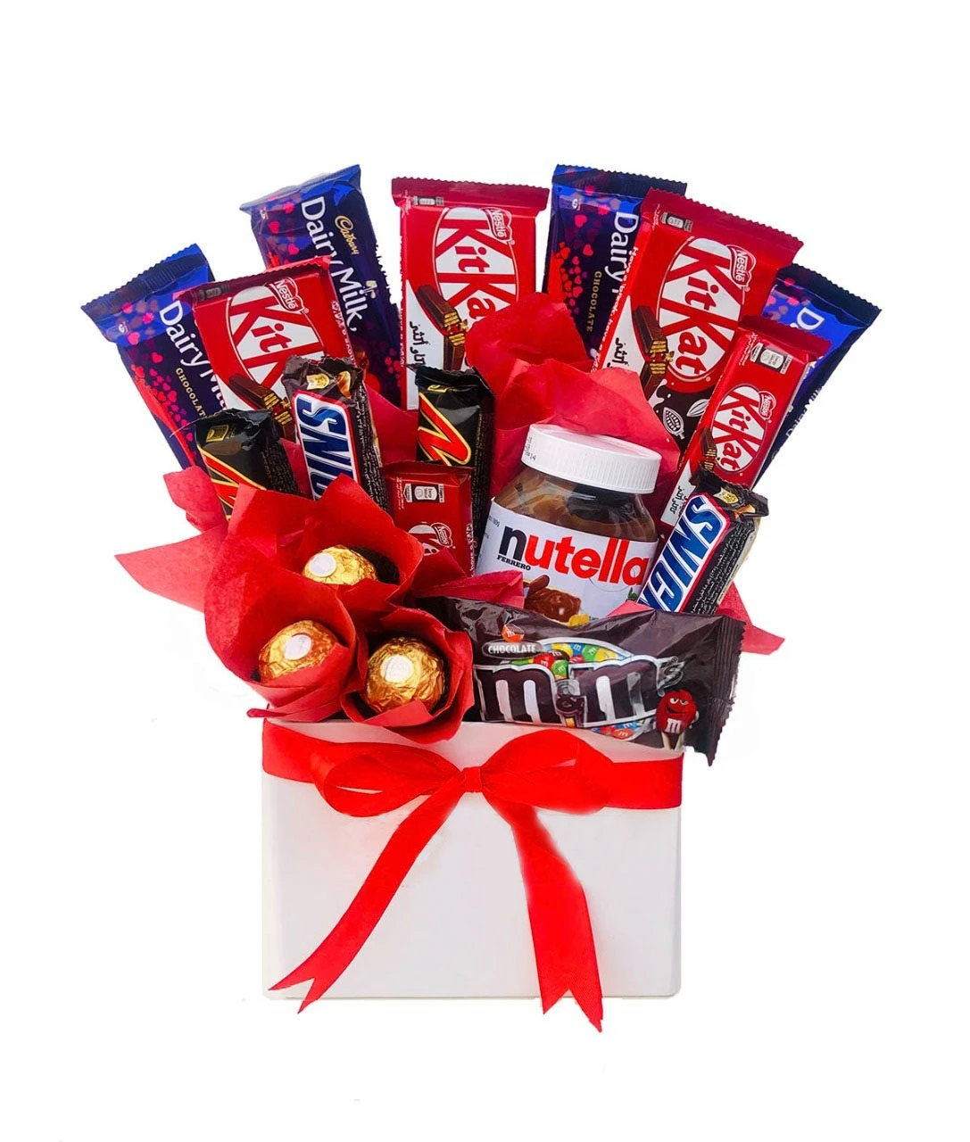 Featuring original assorted chocolates bars including Mars, Snickers, Nestle KitKat, Cadbury Dairy Mlik, M & M’s with a bottle of Nutella or Choco bliss by Young’s (as per availability) and original Italian Ferrero Rochers beautifully arranged in our customized box